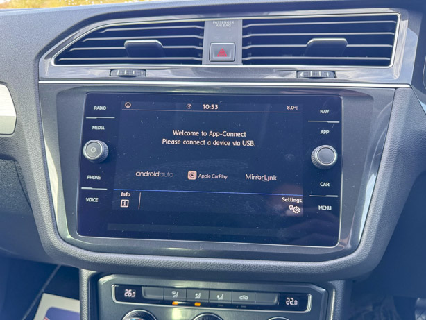 With an exceptionally low mileage of just 38,100 miles for its 2018 registration, this Volkswagen Tiguan TSI SE Navigation presents a remarkable opportunity. This Euro 6 compliant model boasts a 1.4 litre petrol engine and comes with a clear vehicle history check and a full service history, with its last service completed on 26 January 2026 at 38,077 miles. The MOT remains valid until January 2027, and the vehicle is offered with a three month warranty. Notable features include the advanced Park Assist with Rear View Camera and front and rear parking sensors, an Active Info Display for a customisable driving experience, and the Discover Navigation Pro Touch Screen system complete with DVD radio, integrated voice activation, Car Net Guide and Inform Plus, and App Connect for seamless smartphone integration with Android Auto and Apple CarPlay. Further enhancing safety and convenience are the Side Scan blind spot assistance and voice activation capabilities.